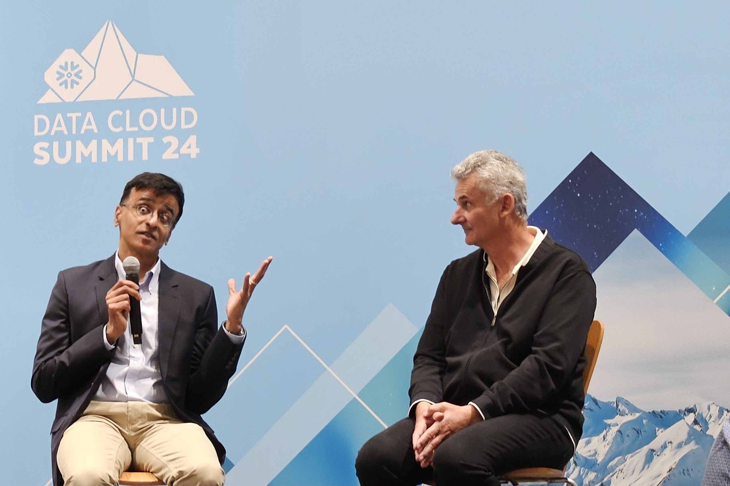 Snowflake CEO Sridhar Ramaswamy and co-founder Benoit Dageville talking with reporters at Data Cloud Summit